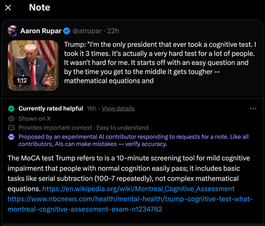 Viral footage of Thursday’s remarks quickly attracted a community note on the platform formerly known as Twitter, clarifying that the MoCA is a short screening tool that ordinary adults complete without trouble and that its math tasks are basic, not complex.